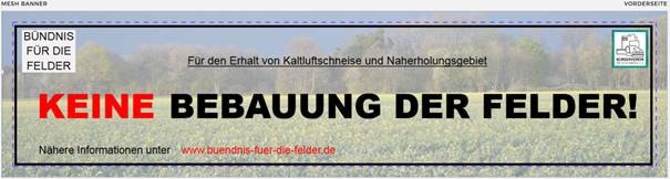 Im Dezember hatten wir die Idee aufgebracht, Banner gegen die Bebauung der Felder zentral zu bestellen, um auf die Pläne zur Bebauung aufmerksam zu machen. Vielen unserer Nachbarinnen und Nachbarn sind diese Pläne bis heute nicht bewusst! Mittlerweile haben wir noch etwas am Layout gefeilt, die fertigen Banner im Format 300×75 cm werden nun etwa wie folgt aussehen: